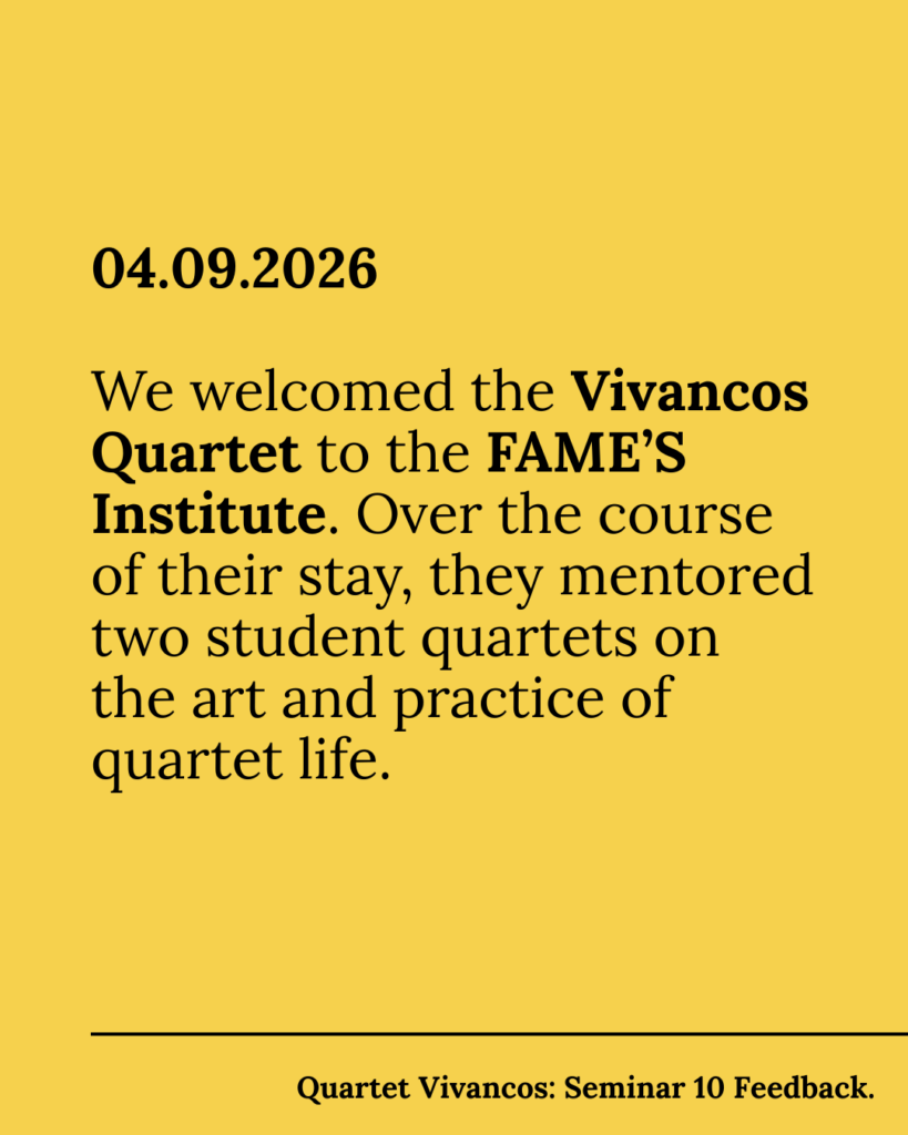 On 04.09.2026, we welcomed the Vivancos Quartet to the FAME’S Institute. Over the course of their stay, they mentored two student quartets on the art and practice of quartet life.