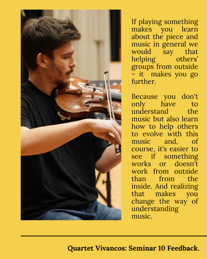 From Vivancos we have amazing memories of this experience. On the one hand, being able to learn some quartets together with “students” was great in a lot of ways… If playing something makes you learn about the piece and music in general we would say that helping others’ groups from outside – it makes you go further. Because you don’t only have to understand the music but also learn how to help others to evolve with this music and, of course, it’s easier to see if something works or doesn’t work from outside than from the inside. And realizing that makes you change the way of understanding music.